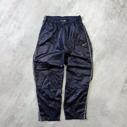 I pantaloni Nike degli anni 2000 rappresentano un'icona di stile sportivo e funzionalità, perfettamente in linea con l'estetica di quel decennio. Realizzati prevalentemente in tessuti tecnici come il nylon o il poliestere, si distinguono per il loro taglio ampio e rilassato, con elastici in vita e alle caviglie che ne accentuano la praticità. Spesso arricchiti da tasche laterali con zip e dettagli riflettenti, questi pantaloni incarnano lo spirito dello streetwear e dell'athleisure di quegli anni. I colori spaziano dal classico nero a tonalità più vivaci, con il logo Nike, ricamato o stampato sulla gamba, che aggiunge un tocco distintivo e riconoscibile.