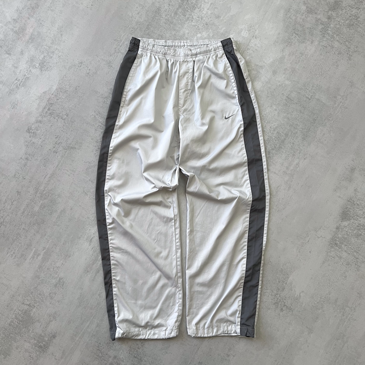 I pantaloni Nike degli anni 2000 rappresentano un'icona di stile sportivo e funzionalità, perfettamente in linea con l'estetica di quel decennio. Realizzati prevalentemente in tessuti tecnici come il nylon o il poliestere, si distinguono per il loro taglio ampio e rilassato, con elastici in vita e alle caviglie che ne accentuano la praticità. Spesso arricchiti da tasche laterali con zip e dettagli riflettenti, questi pantaloni incarnano lo spirito dello streetwear e dell'athleisure di quegli anni. I colori spaziano dal classico nero a tonalità più vivaci, con il logo Nike, ricamato o stampato sulla gamba, che aggiunge un tocco distintivo e riconoscibile.