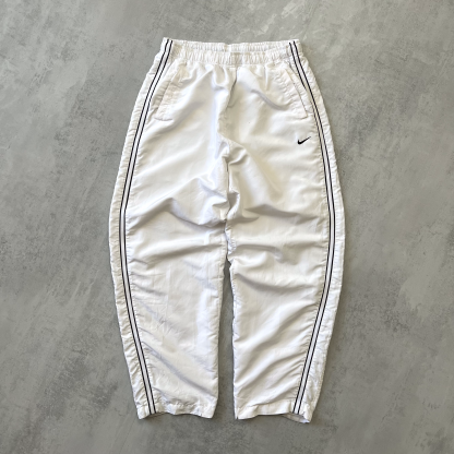 I pantaloni Nike degli anni 2000 rappresentano un'icona di stile sportivo e funzionalità, perfettamente in linea con l'estetica di quel decennio. Realizzati prevalentemente in tessuti tecnici come il nylon o il poliestere, si distinguono per il loro taglio ampio e rilassato, con elastici in vita e alle caviglie che ne accentuano la praticità. Spesso arricchiti da tasche laterali con zip e dettagli riflettenti, questi pantaloni incarnano lo spirito dello streetwear e dell'athleisure di quegli anni. I colori spaziano dal classico nero a tonalità più vivaci, con il logo Nike, ricamato o stampato sulla gamba, che aggiunge un tocco distintivo e riconoscibile.
