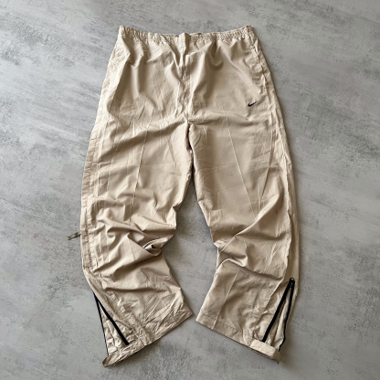 I pantaloni Nike degli anni 2000 rappresentano un'icona di stile sportivo e funzionalità, perfettamente in linea con l'estetica di quel decennio. Realizzati prevalentemente in tessuti tecnici come il nylon o il poliestere, si distinguono per il loro taglio ampio e rilassato, con elastici in vita e alle caviglie che ne accentuano la praticità. Spesso arricchiti da tasche laterali con zip e dettagli riflettenti, questi pantaloni incarnano lo spirito dello streetwear e dell'athleisure di quegli anni. I colori spaziano dal classico nero a tonalità più vivaci, con il logo Nike, ricamato o stampato sulla gamba, che aggiunge un tocco distintivo e riconoscibile.
