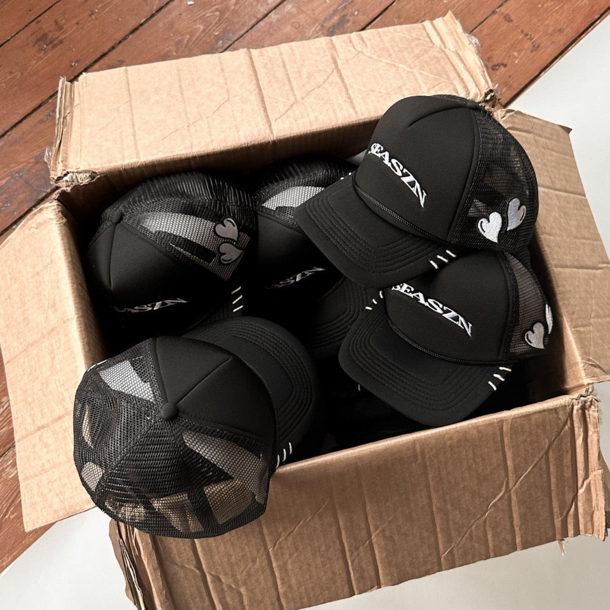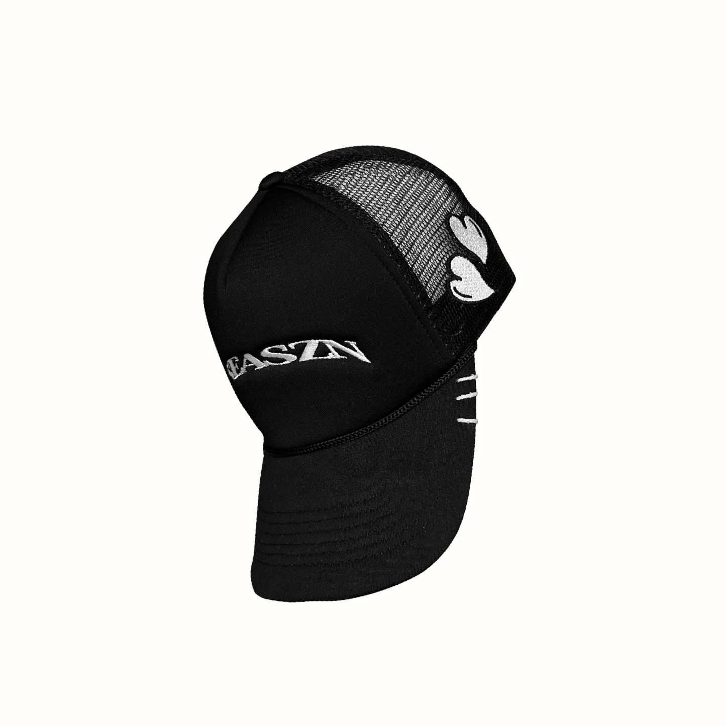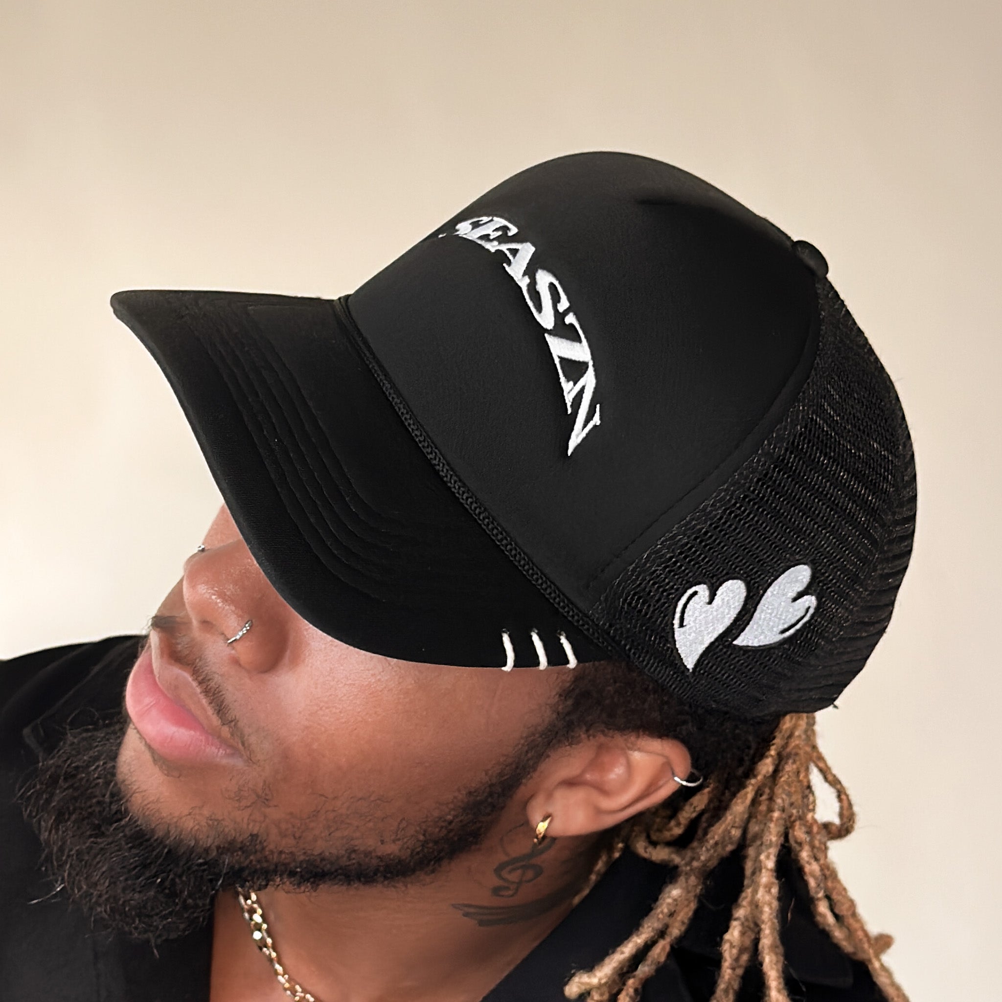 Black foam trucker cap with our embroidered arc logo. Embroidered Hearts logo on side of cap. White rope detailing on the edge of the brim.